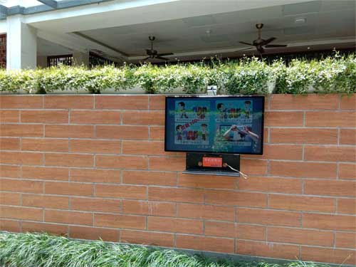 進(jìn)入植物園天上人間公廁的小院中,男女公廁分別有一臺多媒體宣傳屏,實時播放公益廣告,廁所外設(shè)了多個智能高清攝像頭,實時上傳監(jiān)控錄像,對公廁外部環(huán)境的公共安全提供了有效保證。